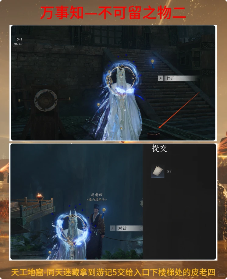 接下来,进入天工地窖的“同天迷藏”区域,取得“游园5”,然后交给入口下楼楼梯处的皮老四。