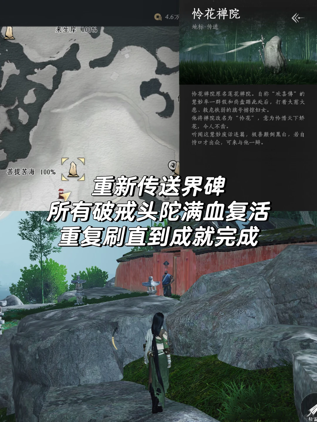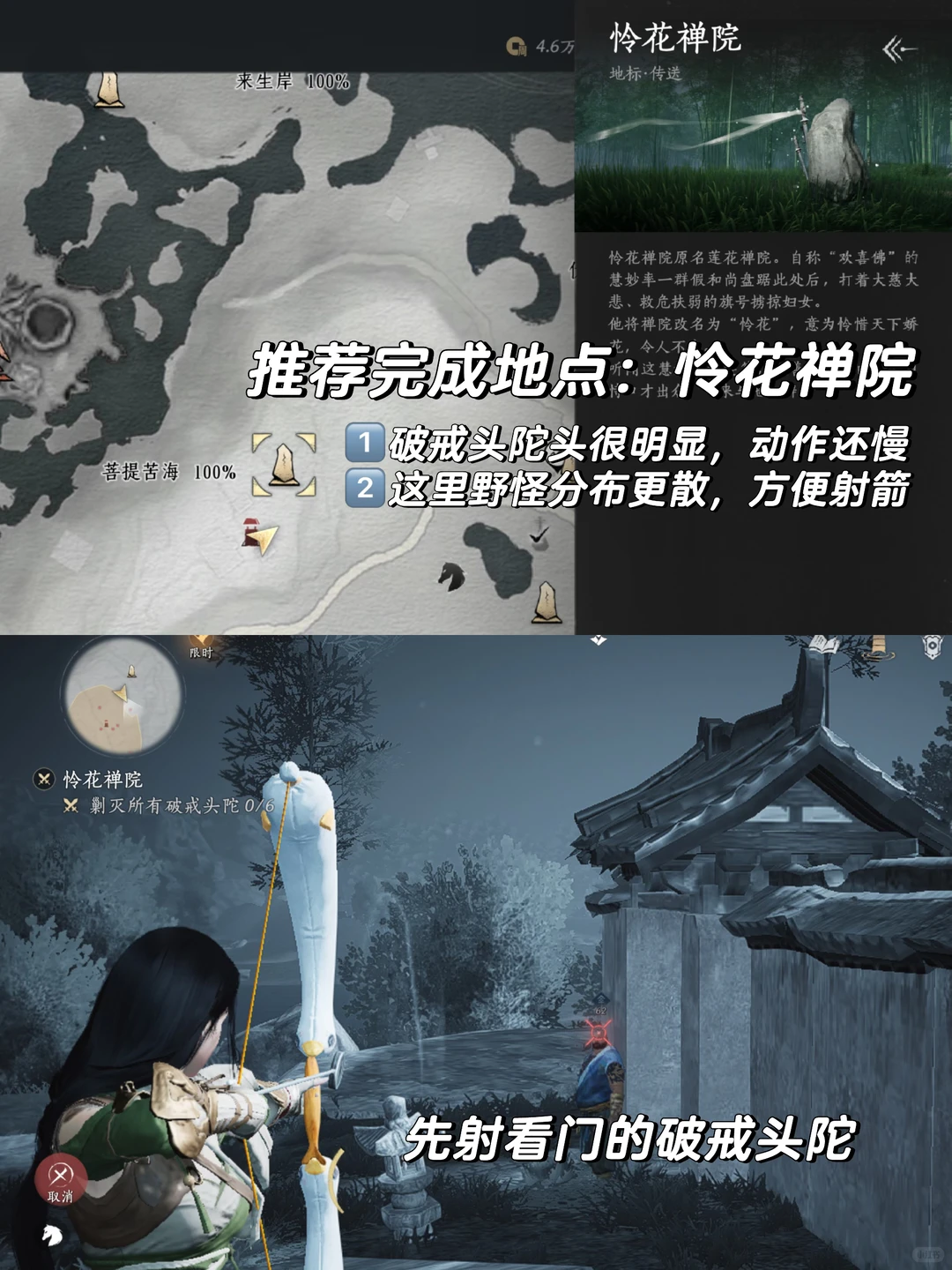 这个成就在成就列表中没有直接显示。经过多次尝试,我找到了一个快速完成的方法:前往“怜花禅院”。在那里,我们可以通过拉满蓄力射击来高效累积次数。