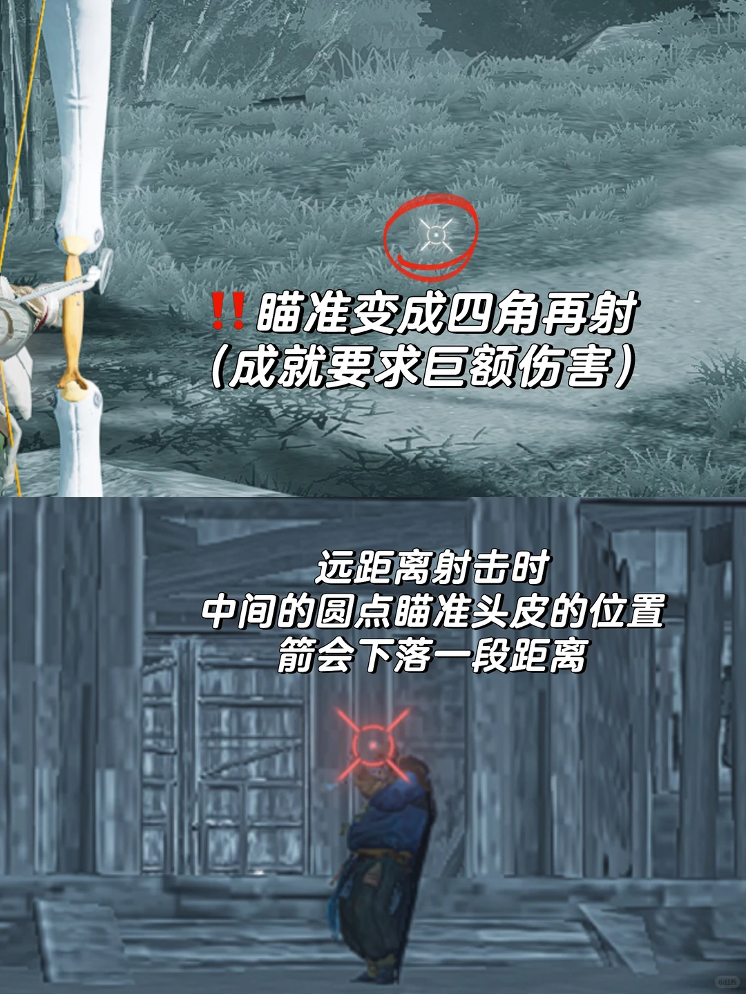 具体操作是:当拉满蓄力时,瞄准场地中央有四条杠的大概位置,反复射击传送回界碑即可。大约重复10轮就能达成成就(每轮大约能射出10箭,具体数量与个人准度有关)。
