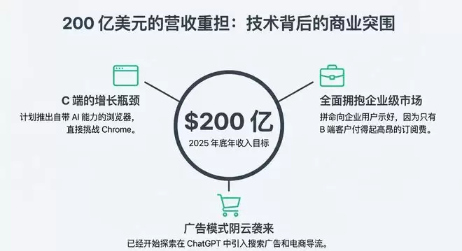 据内部透露,OpenAI的目标是在2025年底达到200亿美元的年收入。为了支撑这个宏大的数字,以及未来几年高达1.4万亿美元的算力支出,OpenAI必须变得更加“现实”。