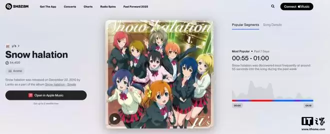 经过IT之家的实际测试,该功能已在网页版Shazam中上线。以μ’s的《Snow halation》这首歌为例,在过去一周内,大部分听众都会在歌曲播放到55秒至1分钟整的这个时间段打开Shazam进行识别。同时,55秒到1分40秒之间的片段热度值最高,这表明绝大多数听众会直接跳转到这部分开始欣赏。