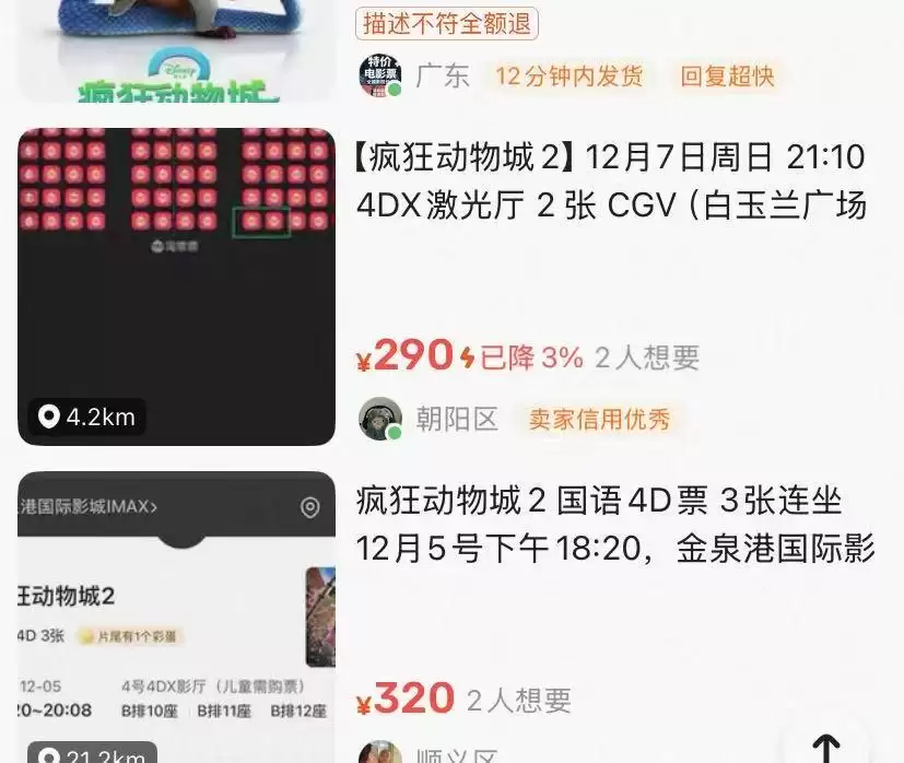 《疯狂动物城2》4D场次供不应求,二手平台黄牛票炒至数百元