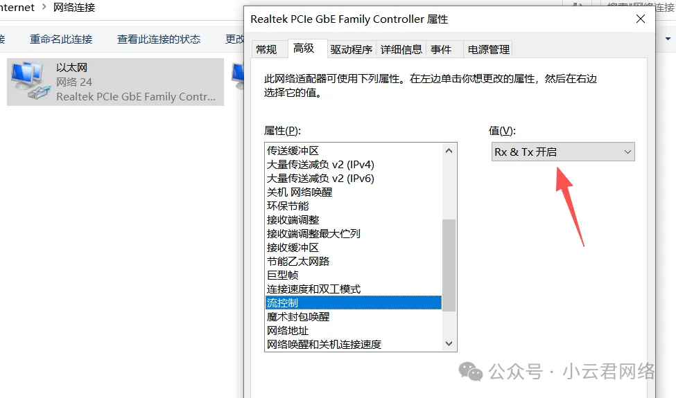 确实能看到PC所在的千兆网口触发了流控,理论上路由器应该发送流控帧通知PC放慢发送速度,这样调流后网络应该恢复正常。可直播用的PC似乎不听从指令或是不支持?查看了一下PC的网卡设置,默认的TX&RX流控都是开启的: