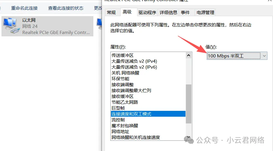 有点玄学!不管了,反正大概率就是这个1G到100M的端口速率不匹配导致的丢包。为了进一步验证,我们将PC网口手动改为100M全双工模式,保证专线—路由器—PC整个链路都是纯百兆环境再进行测试: