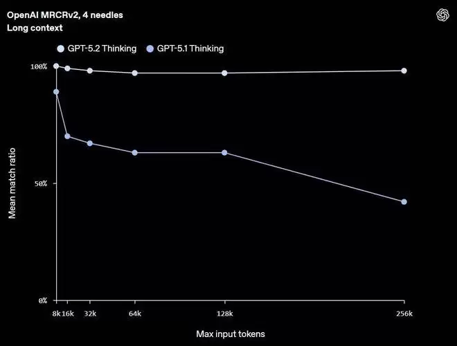 特别值得注意的是,GPT-5.2 Thinking 是 OpenAI 首个在 4-needle MRCR 变体(长度可达 256k tokens)上达到接近 100% 准确率的模型。