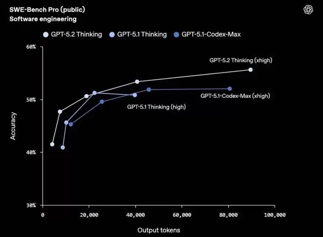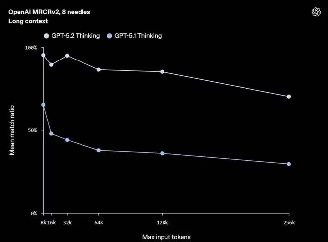 这使得 GPT-5.2 Thinking 可以处理更多依赖工具、运行时间较长的工作流,而不会受到上下文长度的限制。