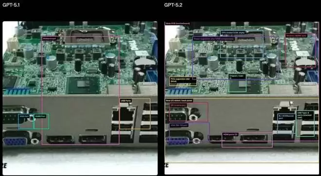 在下方的示例中,OpenAI 要求模型识别输入图像(本例中为主板)中的组件,并返回带有大致边界框的标签。即使在低质量图像上,GPT-5.2 也能识别出主要区域,并放置有时能与每个组件真实位置相匹配的框;而 GPT-5.1 仅标记了少数几个部分,且对其空间排列的理解要弱得多。