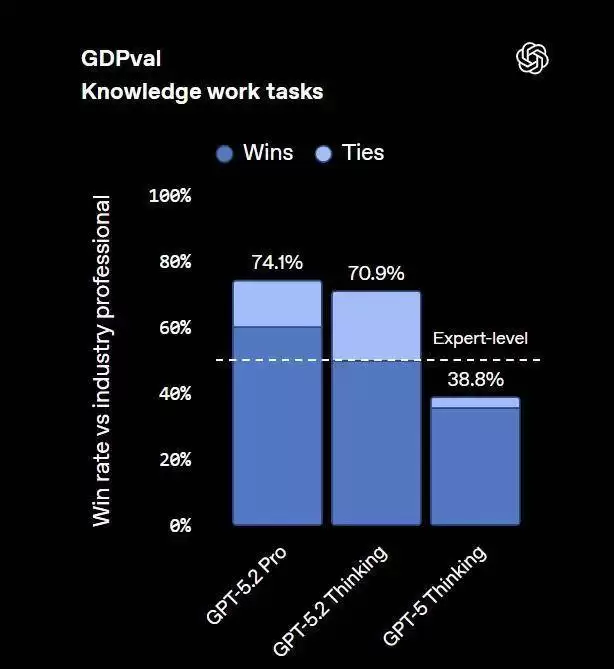 根据专业评审的判断,在 GDPval 的知识工作任务对比中,GPT-5.2 Thinking 在 70.9% 的对比中击败或与顶尖行业专家持平。这些任务包括制作演示文稿、电子表格以及其他专业产出物。