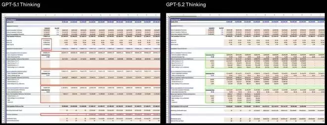 对比显示,GPT-5.2 Thinking 在生成电子表格与演示文稿时,在专业度与排版质量上都有显著提升: