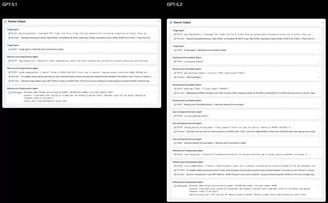 在下面的案例中,一位旅客报告了航班延误、错过了转机、需要在纽约过夜以及医疗座位需求。GPT-5.2 管理了整个任务链(重新预订、特殊协助座位和赔偿),提供了比 GPT-5.1 更完整的结果。