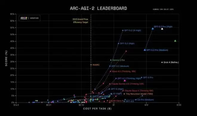 在 ARC-AGI-1 (Verified)(一个旨在衡量通用推理能力的基准测试)上,GPT-5.2 Pro 是首个突破 90% 门槛的模型。相比去年 o3-preview 达到的 87%,它不仅实现了性能提升,还将达成该性能的成本降低了约 390 倍。