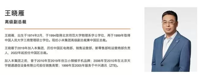 2019年加入小米集团后,王晓雁历任中国区电商部、销售运营部、新零售部和运营商部负责人,2024年起担任中国区总裁。