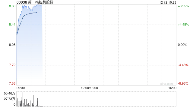 一拖股份(00038)今日盘中一度冲高,涨幅超过9%。近三个交易日,其股价累计攀升逾20%。截至发稿,股价上扬8.42%,报8.76港元,成交额为5856.35万港元。
