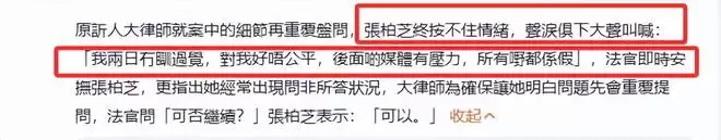 但对方律师并未放过盘问,反复追问之下,张柏芝终于按捺不住情绪,声泪俱下大喊:“我两日未睡过觉,对我好不公平,外面的媒体有压力,所有都是假的”。
