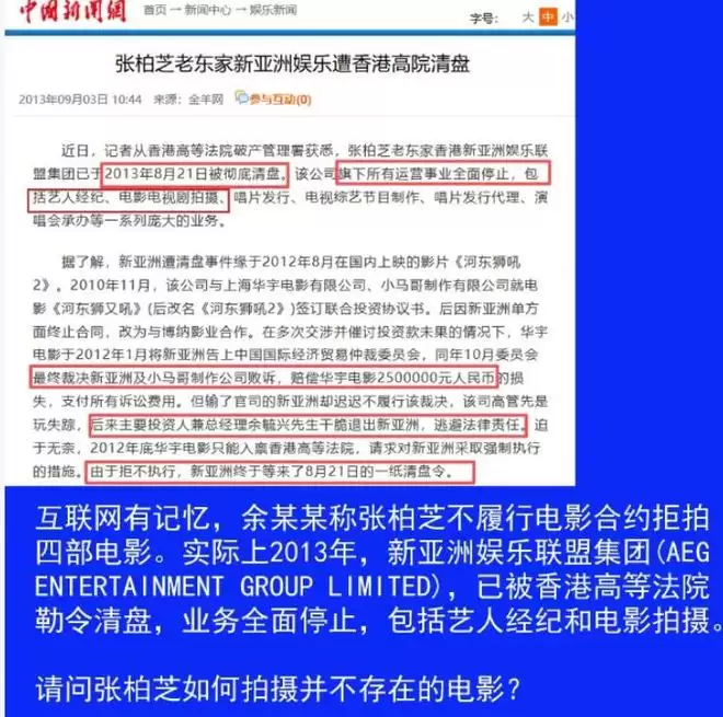 张柏芝则质疑《全球独家经理人合约》是伪造的,签名并非本人笔记,且合约方“新亚洲娱乐”2013年已清盘失效。