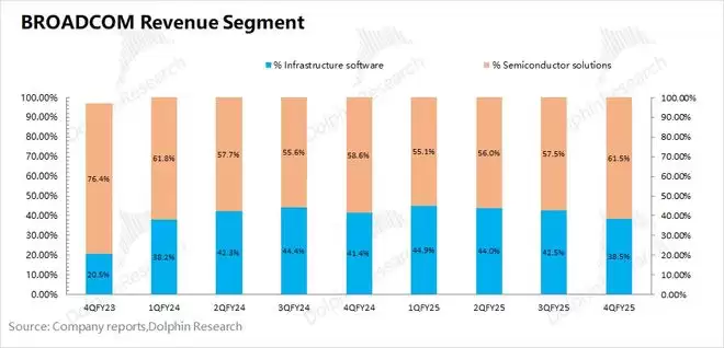 博通BROADCOM (AVGO.O)在2025财年第四季度的基础设施软件实现营收69.4亿美元,同比增长19%。增长主要来自于VMware的并购整合和收费模式调整(从永久许可证模式全面转向于订阅模式)。