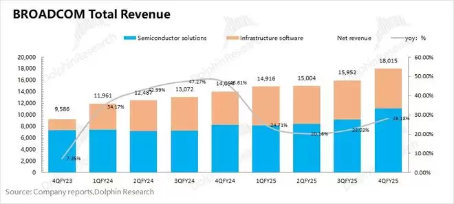 博通BROADCOM (AVGO.O)在2025财年第四季度实现营收180亿美元,同比增长28%,好于市场预期(175亿美元)。同比增长主要来自于AI业务增长的带动。
