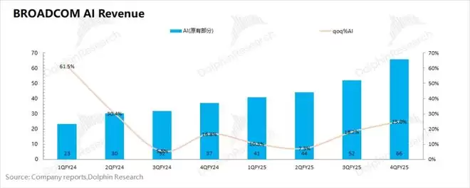 ①AI业务:65亿美元,环比增长13亿美元,好于市场预期(62亿美元)。公司的AI收入主要来自于三大客户(谷歌、Meta和字节),季度增长主要来源于大客户谷歌TPUv6出货增加的带动。