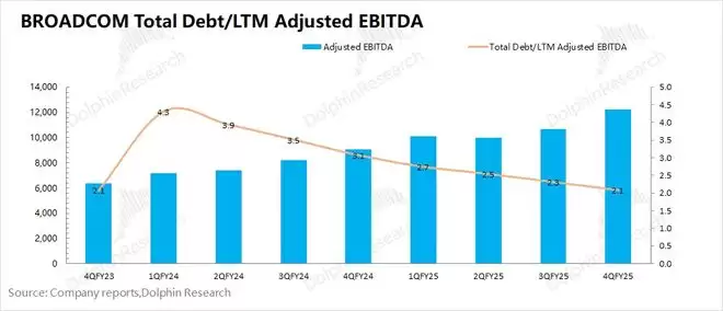 由于博通擅长外延并购,公司通常把调整后EBITDA%作为公司的经营面指标之一。而海豚君测算公司2025财年第四季度的调整后EBITDA%回升至67.8%,好于公司此前指引(67%)。