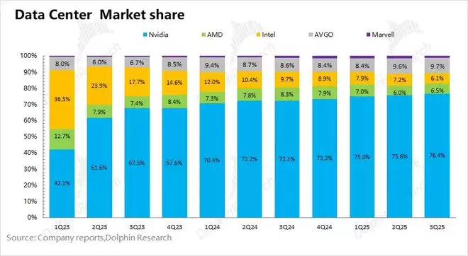 这为市场带来了新的思路,AI大模型也从“纯拼算力的追逐”开始转向于“投入产出比”的考量,这无疑将给英伟达垄断地位带来直接的威胁。当前博通在AI芯片的份额占据一成左右,在TPUv7量产和“性价比”优势的带动下,市场也预期未来会逐步侵蚀英伟达的份额。