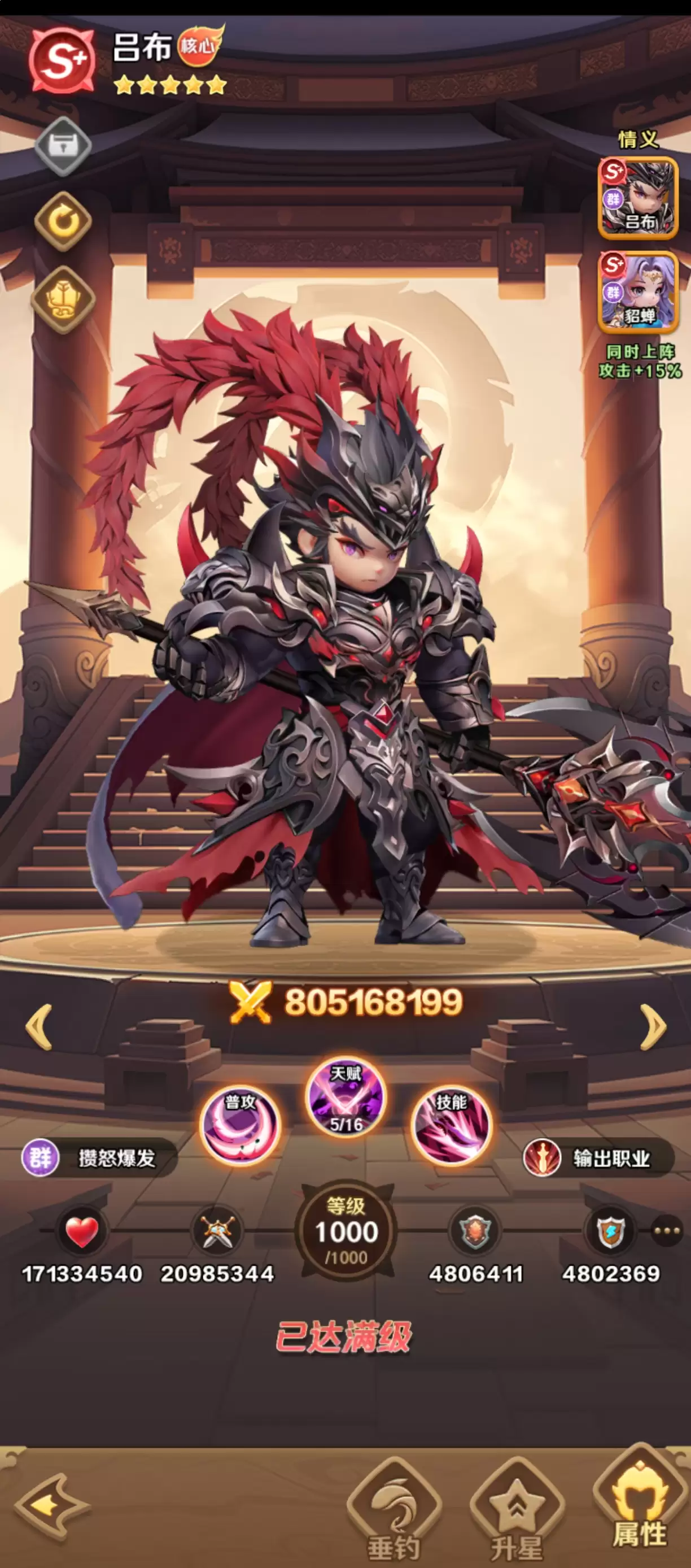 吕布作为后期爆发类型的武将,虽然在战斗启动阶段需要积攒怒气,但当他升至一星解锁“全员打击”技能后,配合高额的伤害加成,一旦怒气蓄满,便可实现“一键清屏”的爽快体验。因此,在后期的阵容构筑中,吕布绝对是可以作为核心的培养人选。