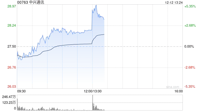 12月12日港股午盘交易时段,中兴通讯股价强势拉升,盘中涨幅一度超过5%,股价最高触及28.98港元。