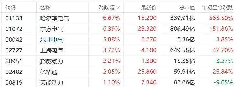港股电力设备股走强:哈尔滨电气与东方电气涨超6%