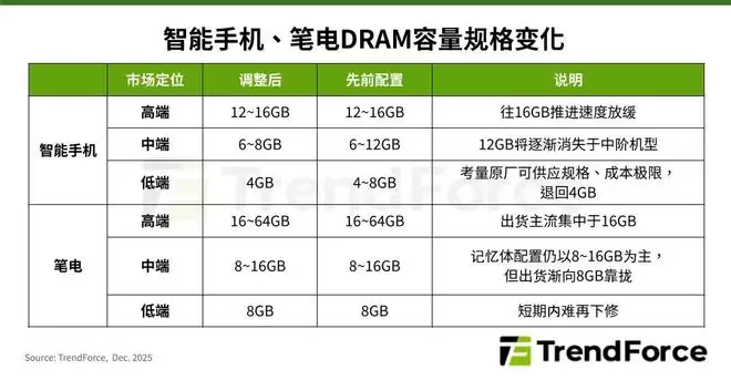TrendForce强调,通过降低配置规格或推迟硬件升级来控制成本,已成为智能手机和笔记本电脑制造商的必要手段,这一点对于在存储成本中占比最大的DRAM来说尤为明显。在中高端机型中,DRAM容量预计将分别向该市场的最低标准靠拢,并放缓提升速度。其中,高端机型可能放缓向16GB推进的速度,而12GB内存或将逐渐消失于中端机型,回落到8GB。