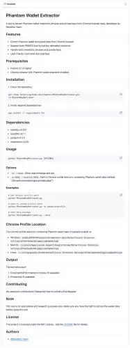 以 PhantomKeyRetriever 工具来说,它是一款专门用于从 Chrome 浏览器数据中提取 Phantom wallet助记词或私钥的脚本,慢雾(SlowMist) 已经在 GitHub 上开源了这个工具 (https://github.com/slowmist/PhantomKeyRetriever),它的核心原理是: