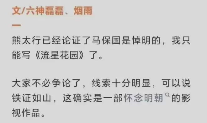 在这篇文章中,六神磊磊通过《流星花园》里的各种小细节,论证了这部作品,其实是一部悼明作品。但是这些“论证”,其实都是他的一种讽刺,讽刺那些不懂历史,还强行进行关联解释历史的人。或者说,他这篇文章的目的,是在用“魔法打败魔法”。