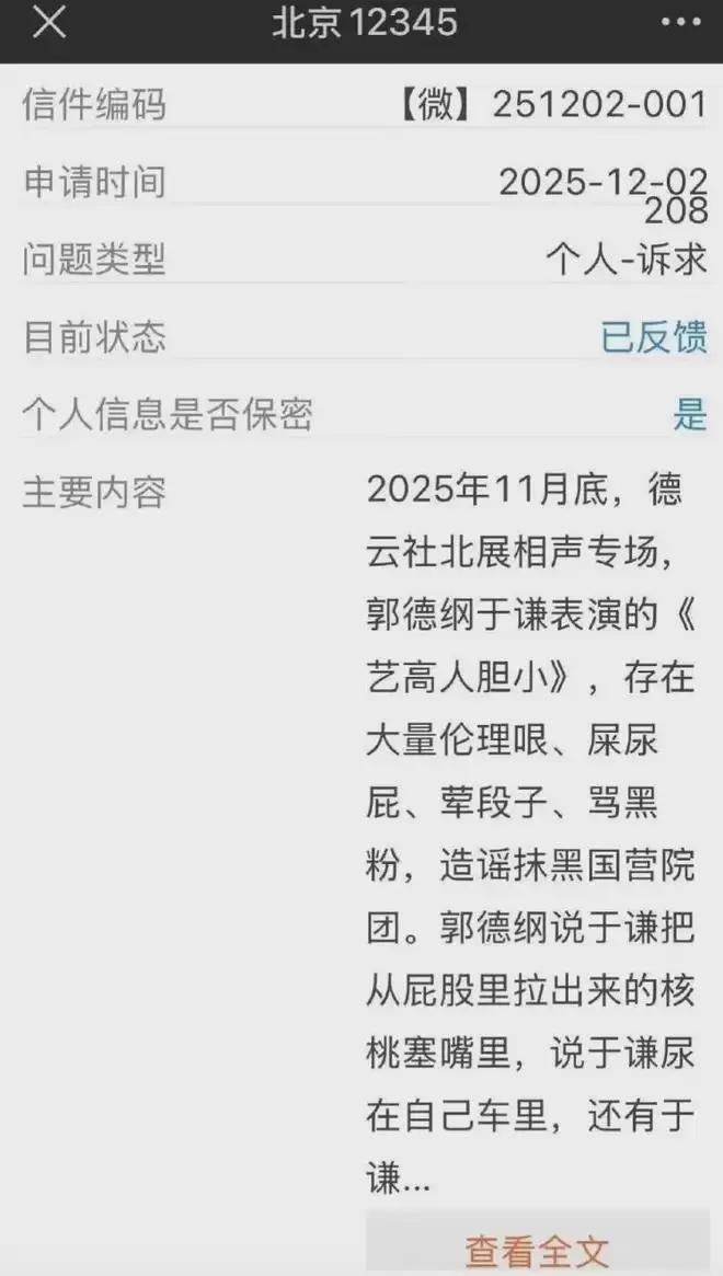 可以看到,举报者举报郭德纲的理由,是玩伦理哏、说屎尿屁、荤段子、骂黑粉,造谣抹黑国营院团,还说于谦把从屁股里拉出来的核桃塞嘴里,还说于谦尿在自己车里,等等……