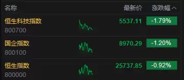 12月10日,港股三大指数集体走低。截至午间休市,恒生指数下跌0.92%,收于25737.85点;恒生科技指数跌幅达1.79%,国企指数则下挫1.2%。盘面上,科技股普遍表现不佳,百度股价跌幅超过4%,快手下跌逾3%,阿里巴巴、小米跌幅均超2%,腾讯、京东、哔哩哔哩、美团、联想等股票的跌幅也均超过1%。与此同时,保险板块逆势走强,其中中国平安(601318)股价创下近四年新高;而生物医药板块表现疲软,百济神州跌幅超过6%;芯片股跌幅尤为显著,华虹半导体股价大跌逾6%。
