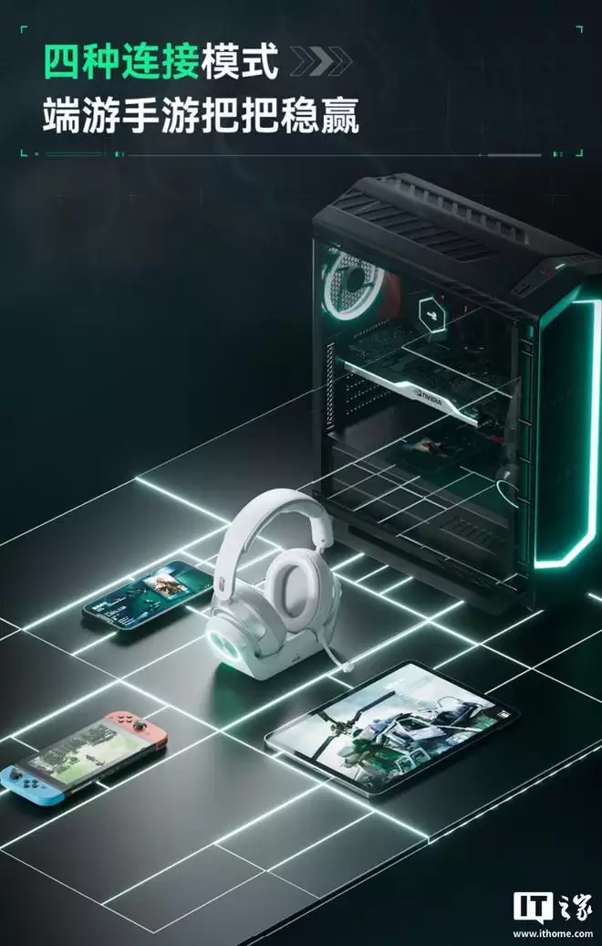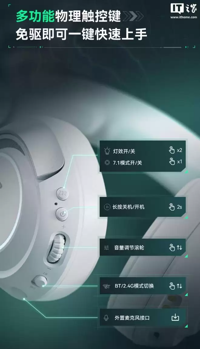此外,这款耳机还带有 2000mAh 电池,续航可达 120 小时,支持蓝牙、USB 有线、2.4G USB-A/USB-C 四种连接方式,拥有多功能物理按键,可直接调节灯效、音效、音量、连接模式等。