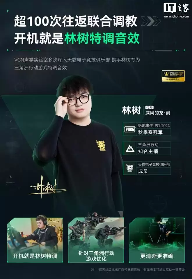 据介绍,这款耳机拥有《三角洲行动》主播林树特调音效,自带三合一 RGB 超竞基站,集充电和 USB HUB 于一身,自带炫彩 RGB 灯带,拥有两个 USB-A 输出接口和一个 USB-C 输出接口,搭载特调 53mm 铝箔沙金单元,频响范围可达 20-40kHz。