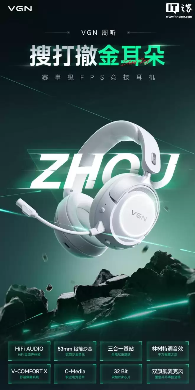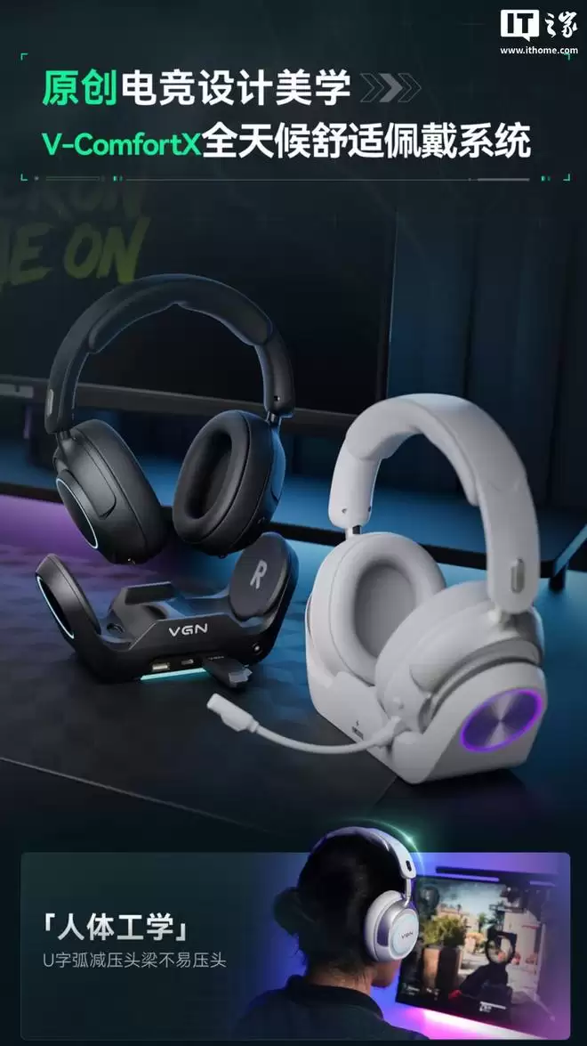 IT之家 12 月 15 日消息,VGN 现已推出周听系列头戴式电竞耳机,搭载 53mm 铝箔沙金单元,自带三合一全能 RGB 基站,售价 199 元起。