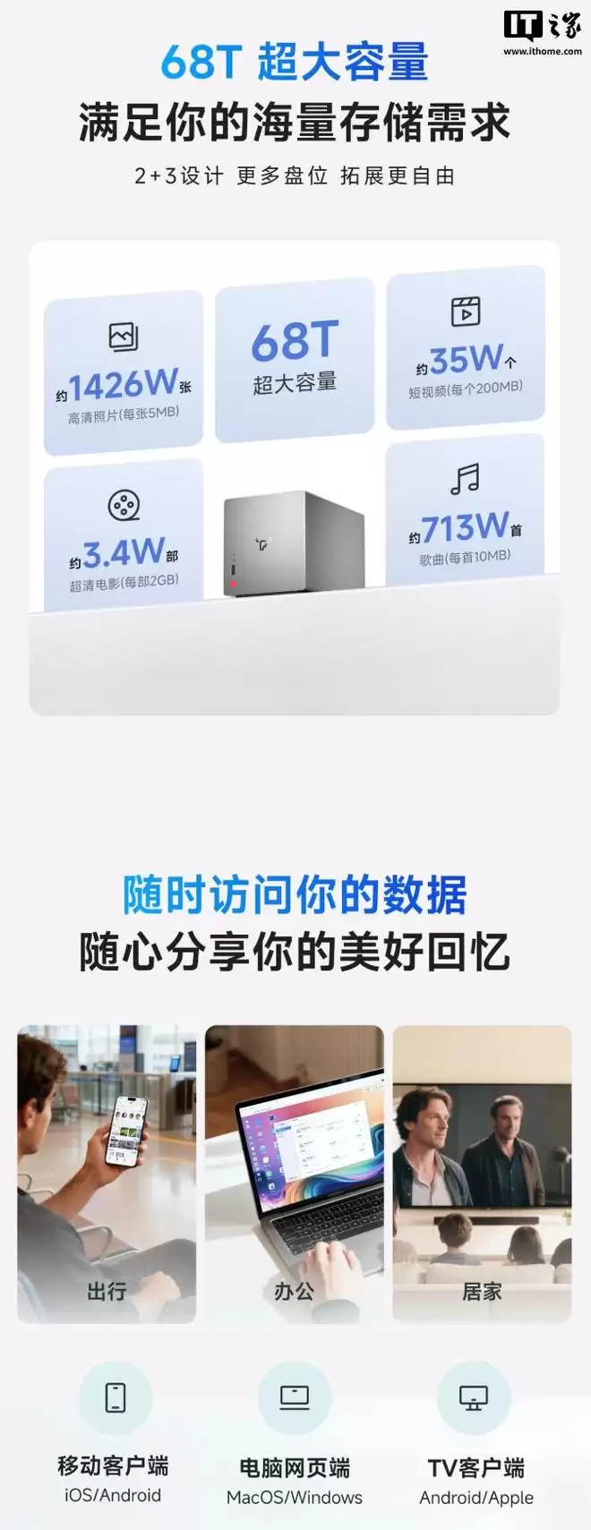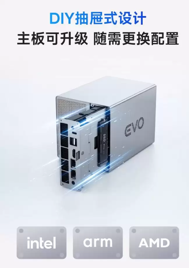 据介绍,这款 NAS 搭载英特尔 N150 四核 CPU,最高睿频可达 3.6GHz,性能释放可达 25W,支持解码 AVC、HEVC、VP9 等视频编码,可选 8GB 和 16GB 内存,主板采用抽屉式推拉设计,可随时升级 / 更换英特尔 / AMD / ARM 平台。