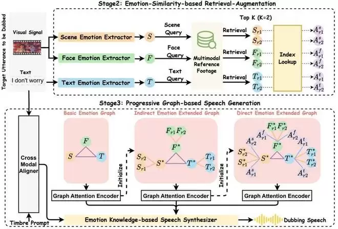 最终的 “渐进式演绎”:理解之后,如何表达?系统提出了渐进式图结构语音生成方法。它像演员搭建表演层次一样,逐步将检索到的情感知识(从基本情绪到间接多模态信息,再到直接的参考音频)融合进语音生成中,确保最终输出的配音情感饱满、层次丰富。