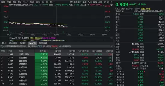 12月15日午后,港股芯片产业链延续弱势格局,华虹半导体跌幅超过7%,英诺赛科下挫逾6%,峰岹科技跌超5%,中芯国际、鸿腾精密跌幅也均在4%以上。全市场首家聚焦“港股芯片”产业链的港股信息技术ETF(159131)场内价格现跌2.88%,实时成交额突破4200万元。盘中溢价持续走阔,显示资金正加速进场布局,截至发稿已获得实时净申购超600万份。