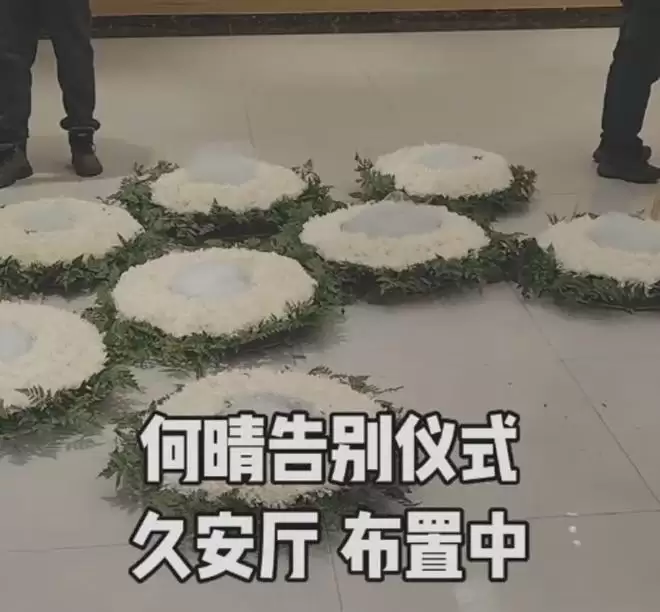 有网友晒出为何晴告别仪式做准备的画面,众人一早就开始布置了,大厅两边摆满纯白色的花圈。