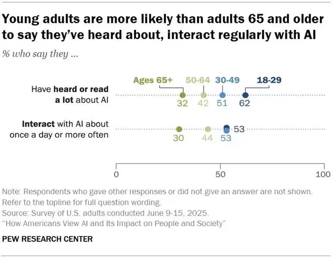 不同年龄段每天使用AI的比例对比。18–29岁的年轻人是最频繁、最熟悉AI的群体:53%每天使用一次以上,远高于65+的30%。