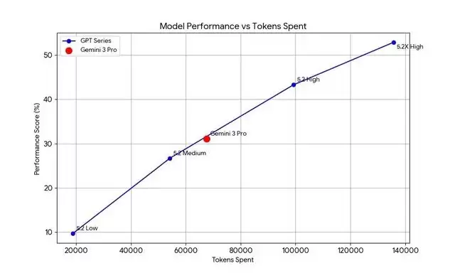 一句话总结就是:在调整token使用后,GPT-5.2和Gemini 3 Pro在ARC AGI 2上的表现基本相当。