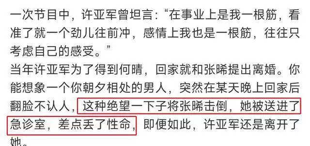 细品这段婚姻的结束,其主要核心矛盾是因为家庭观念冲突:许亚军希望女方放弃事业回归家庭照顾孩子,而何晴则不愿妥协。因为当时的何晴正值事业上升期(刚演完四大名著),双方无法调和,离婚是唯一的出路。