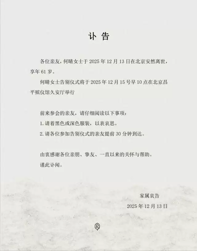 据悉,何晴于2015年确诊罹患癌症,经历艰苦治疗后于2016年复出,出演《女医·明妃传》。这么多年,何晴一直拿老戏骨李雪健给自己加油打气,只可惜何晴还是悄无声息地离开了。不过,据家属发出的讣告来看,何晴于12月13日在北京安然离世的。