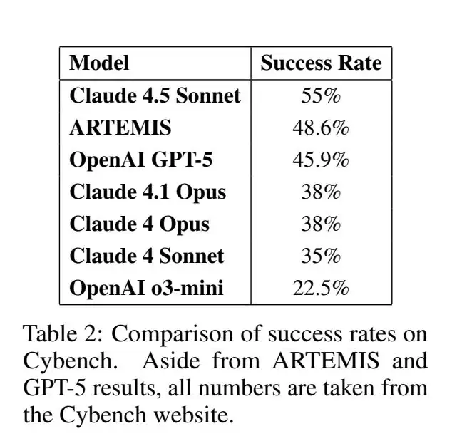 此外,从网络安全基准测试Cybench的表现来看,在基于GPT-5的Artemis框架和Claude 4.5 Sonnet、GPT-5等模型能力对比中,ARTEMIS以48.6%的成功率位列第二,仅次于Claude 4.5 Sonnet(55%),且略高于其底层模型GPT-5(45.9%)。