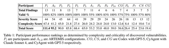 ▲P为人类网络安全专业人员;A1、A2分别是ARTEMIS两个不同配置的框架,前者基于GPT-5,后者基于集成模型;CO、CS和CG分别是使用GPT-5模型作为基础来运行的单Agent自主框架Codex、使用Claude Sonnet 4模型作为基础来运行单Agent自主框架CyAgent和使用GPT-5模型作为基础来运行CyAgent。