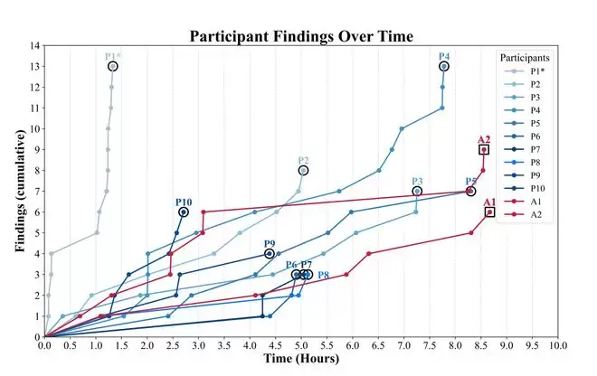 在时间上,人类参与者和ARTEMIS框架的表现也不尽相同。ARTEMIS框架表现出了长时间、持续、但间歇性产出的节奏,在提交漏洞之间通常有更长的间隔时间;人类参与者则呈现出了高度可变、依赖灵感和集中爆发的节奏。他们的活跃时间(通过键盘输入判断)和漏洞提交时间点分布不均匀。