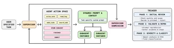 它有三个核心组件:一个监督器,负责管理工作流;一组任意子Agents集群,负责执行具体任务;一个漏洞分级器,负责漏洞验证。