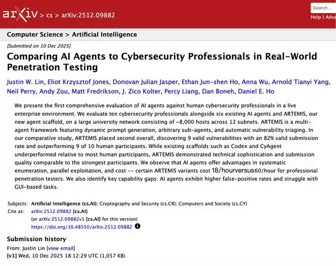 该论文现已发布在arXiv上,题为《将AI Agents与网络安全专业人员在真实世界渗透测试中的表现进行比较(Comparing AI Agents to Cybersecurity Professionals in Real-World Penetration Testing)》。