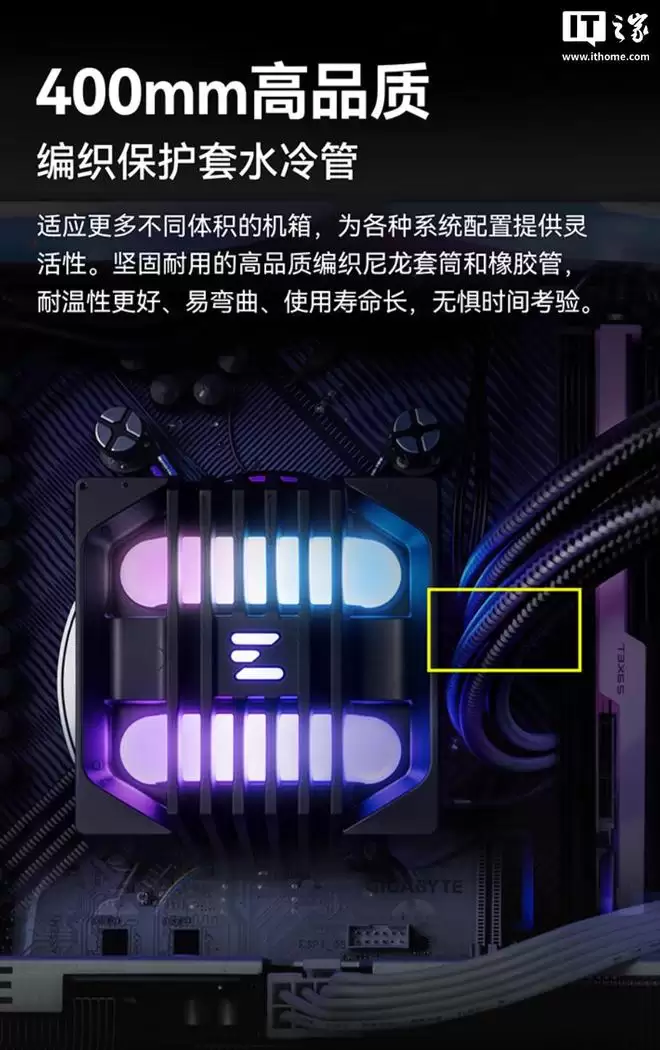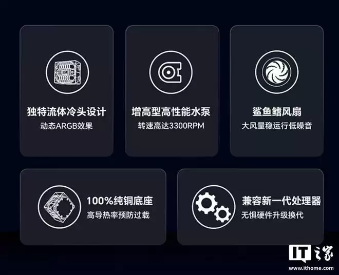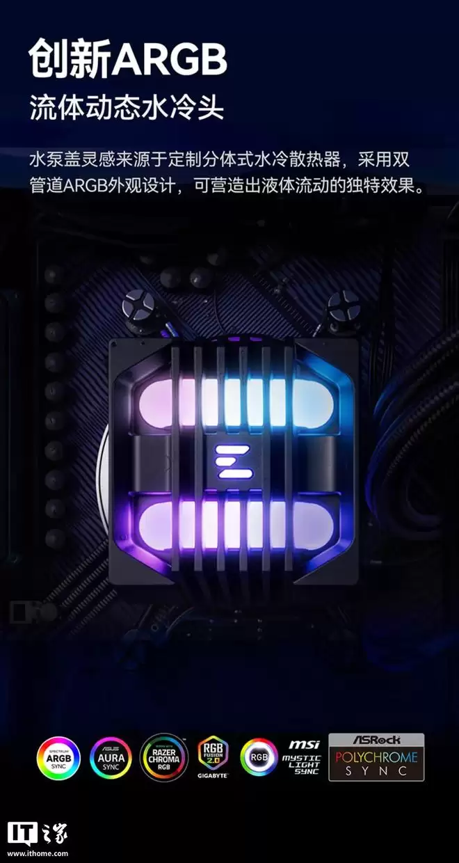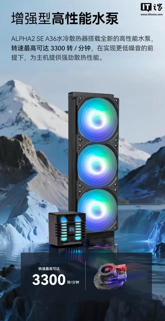 据介绍,这款水冷配备流体动态冷头,灵感源于定制分体式水冷散热器,采用双管道 ARGB 外观设计,可营造液体流动的独特效果,搭载全新高性能水泵,转速最高可达 3300 转 / 分钟,可在低噪音的前提下提供强劲散热性能。