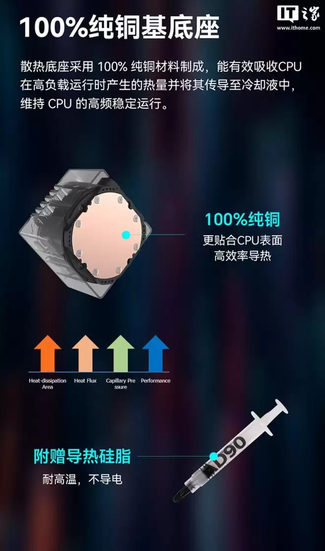 此外,这款水冷的散热底座采用 100% 纯铜材质,附赠导热硅脂,拥有高热容量冷排,可带来更大散热面积,支持英特尔 LGA 1851/1700/1200/115X 和 AMD AM5/AM4 CPU。